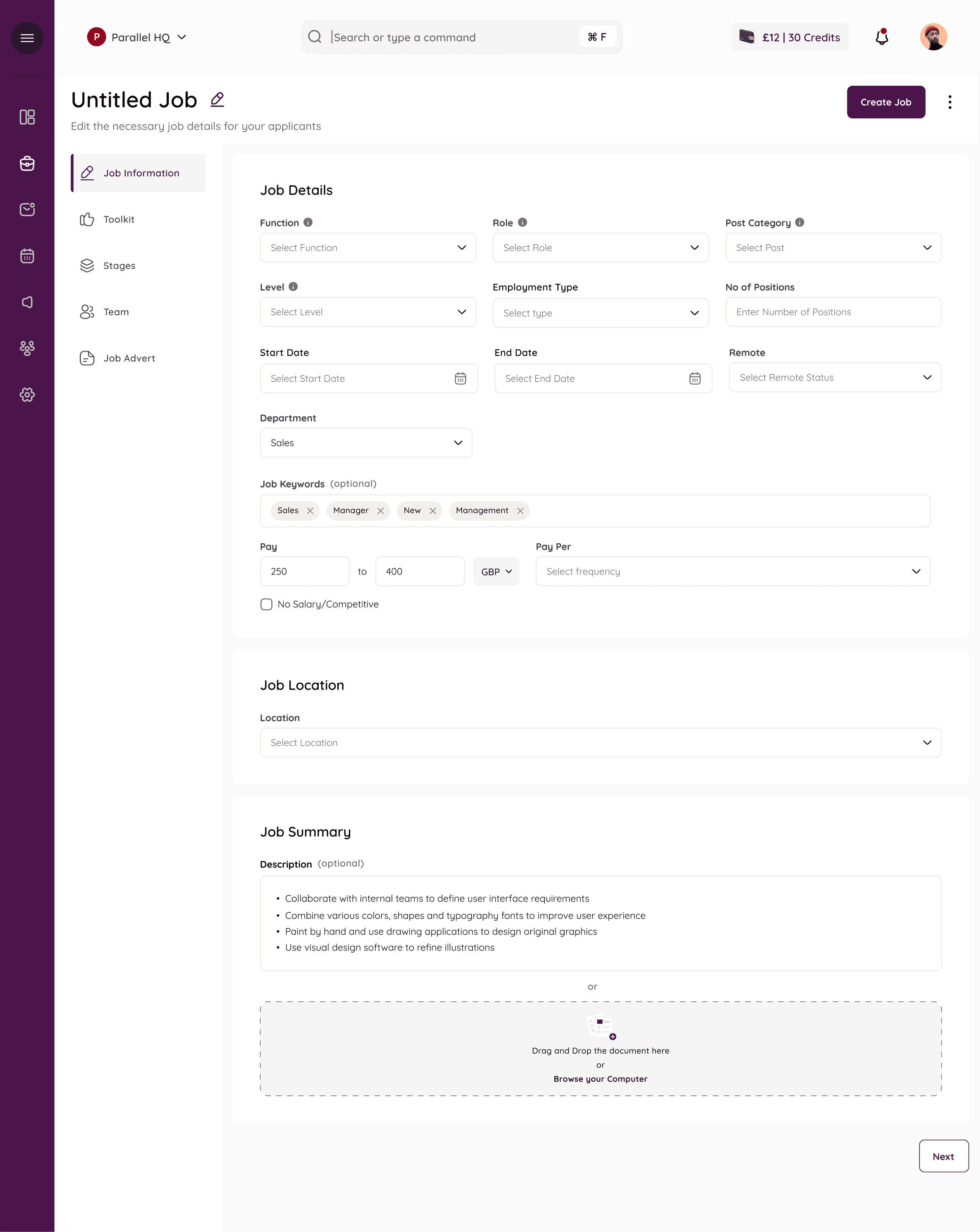 Creating a new Job : The creation procedure is split into five steps. The user can also choose to use a template if they wish to.