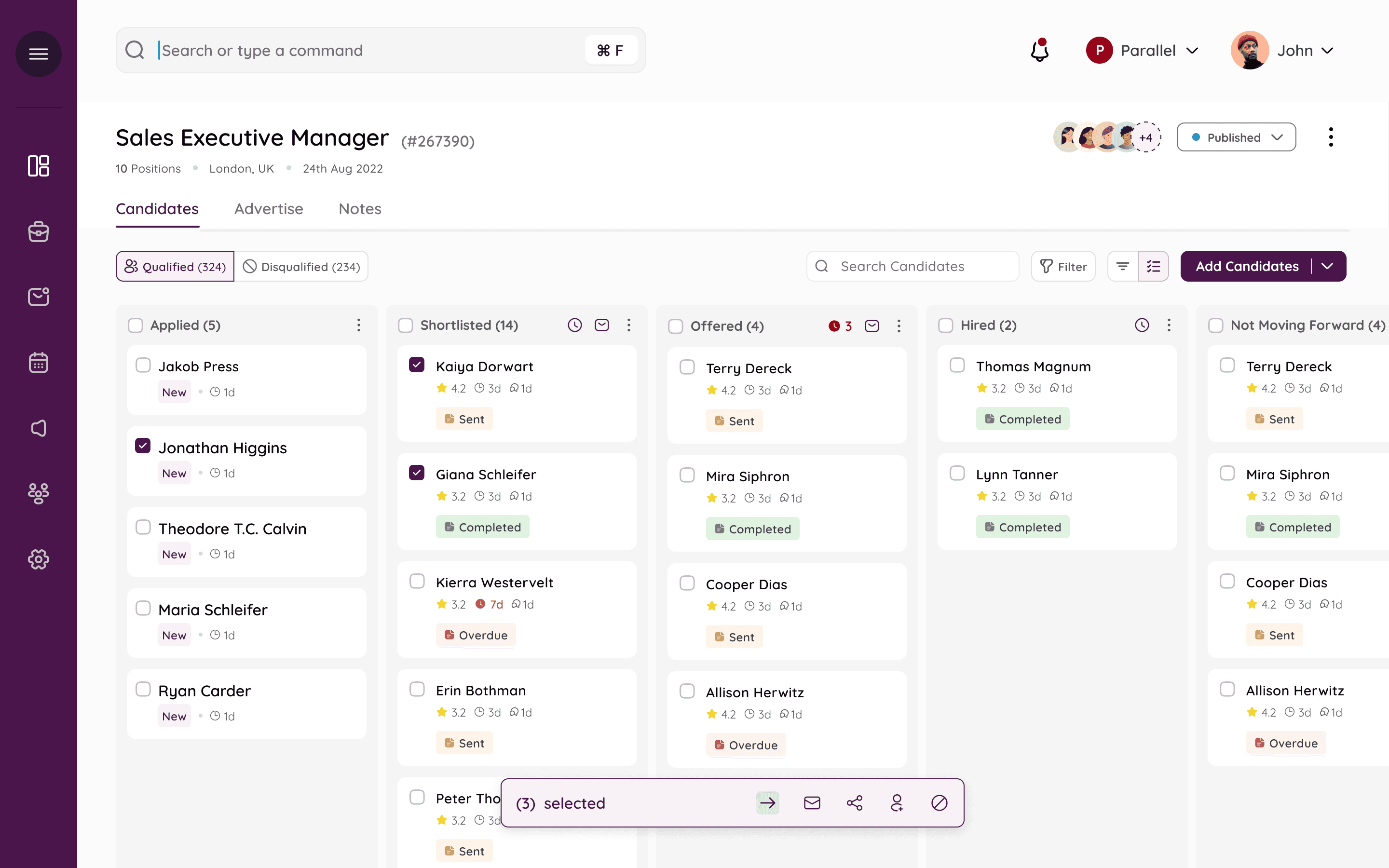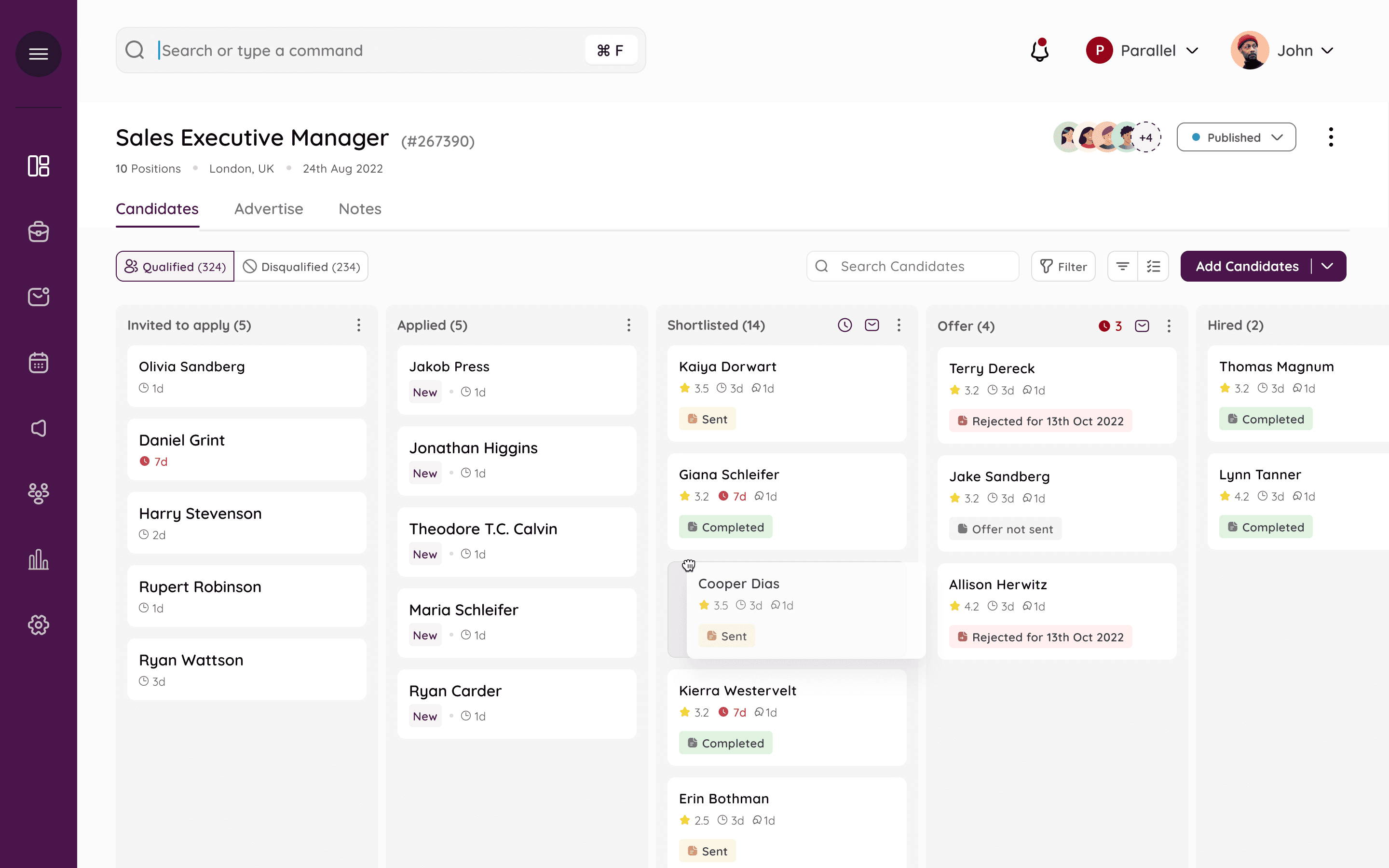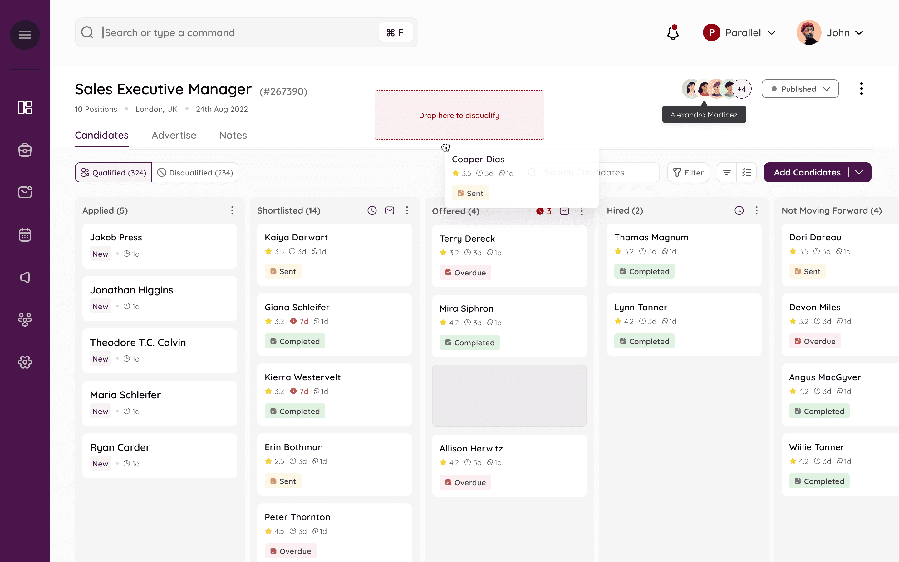 Recruiter can do a lot of things on the Kanban, like easily drag and drop from one stage to another.