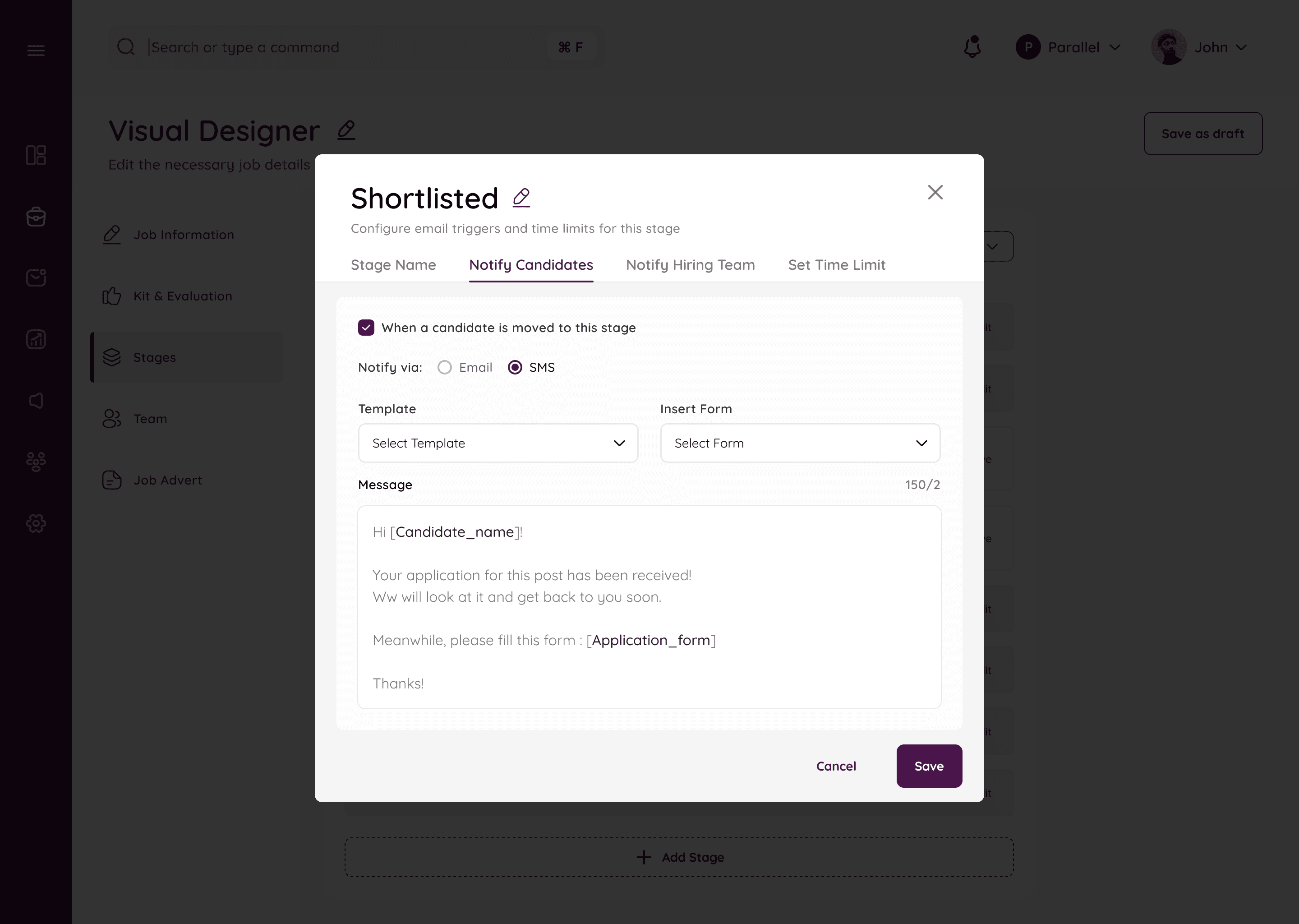Creating a new Job- Stages : Each job has it’s unique stages for the interview process. Hiring Stages can have default stages ( which are denoted with a lock, these are stages that are necessary and common across all hirings.) Users can choose to add more stages for any particular job which they can toggle on or off.