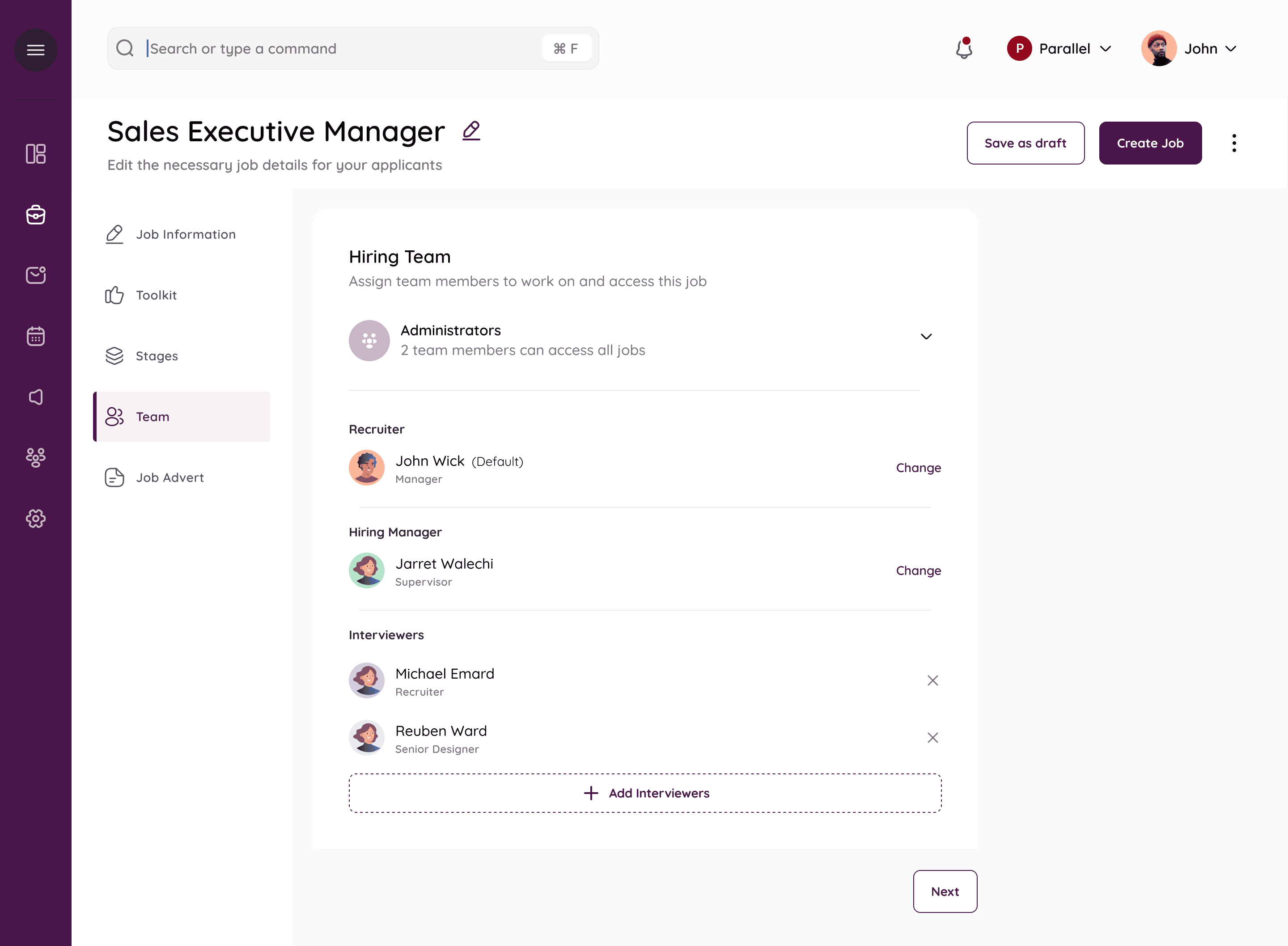 This step consists of giving access and deciding the hiring panel. There is one recruiter by default and one hiring manager. The admin has access to all jobs, and all actions on those, like a super admin who can change recruiters or hiring managers.